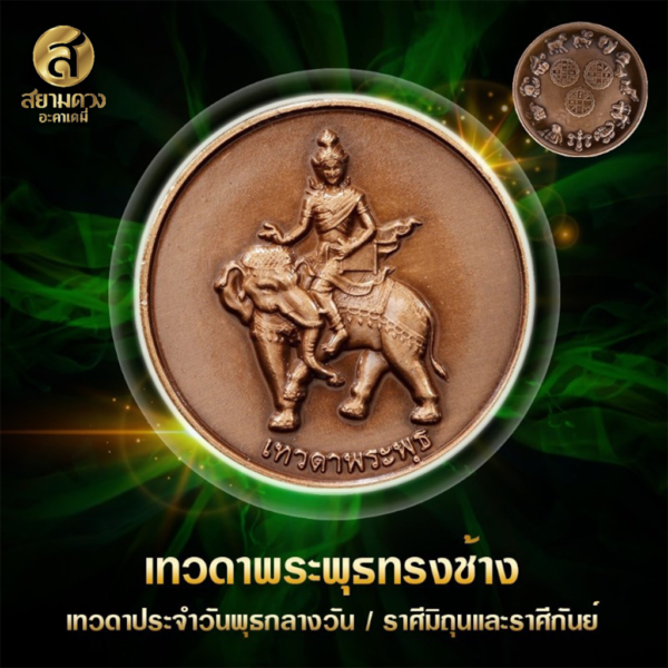 เทวดาพระพุธทรงช้าง – “เทพเจ้าแห่งปฏิภาณ ไหวพริบ และปัญญา” เทพประจำคนเกิดวันพุธกลางวัน (เกิดวันพุธตั้งแต่เวลา 06.00 น. – 17.59 น.) และคนที่เกิดราศีเมถุน (คนที่เกิดระหว่างวันที่ 14 มิถุนายน – 14 กรกฎาคม) , ราศีกันย์ (คนที่เกิดระหว่างวันที่ 17 กันยายน -16 ตุลาคม)